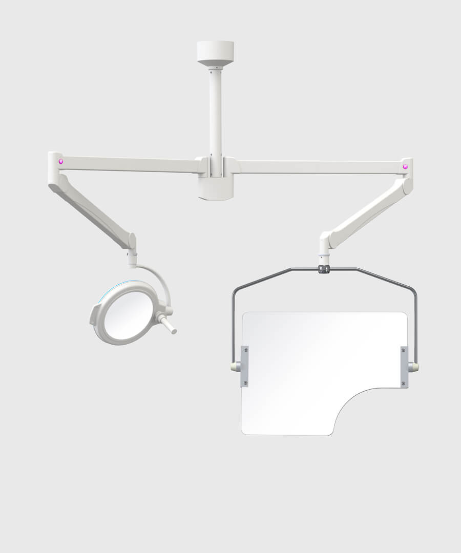 Installation: 250 cm ceiling track system & energy chain (cable management system), Lamp: LED 150F, Flexible lead panels fitted to lower profile of shield: No