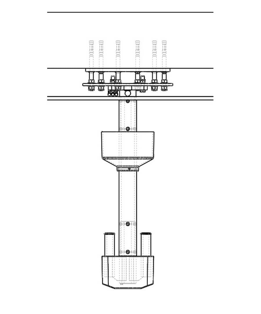 Twin pin steel ceiling column, stationary mounted on the ceiling or attached to the carriage in the Kenex ceiling track.