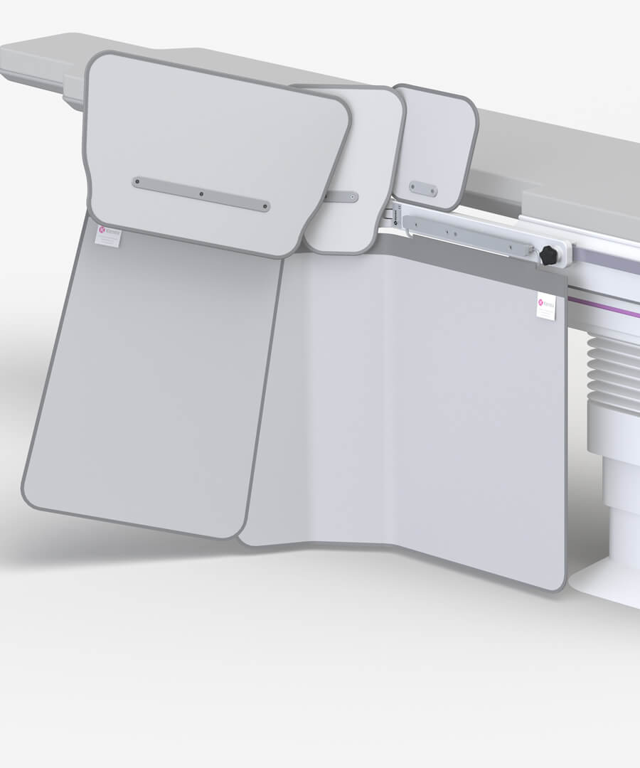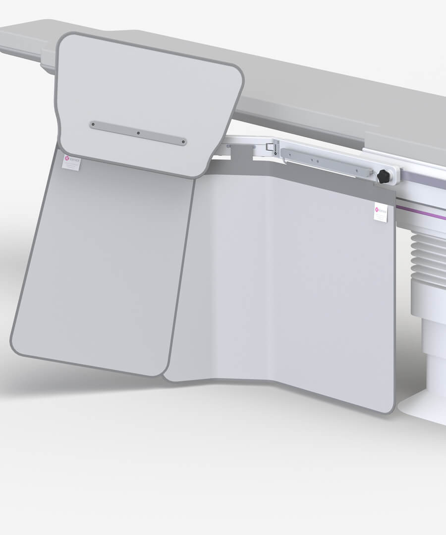 - Fitted with a patented device enabling upward movement of the pivotal arm when in collision with C-arm equipment.