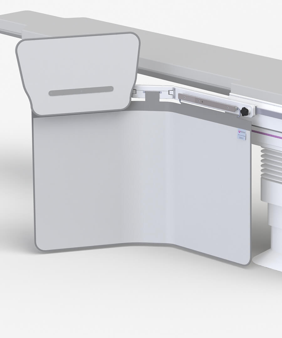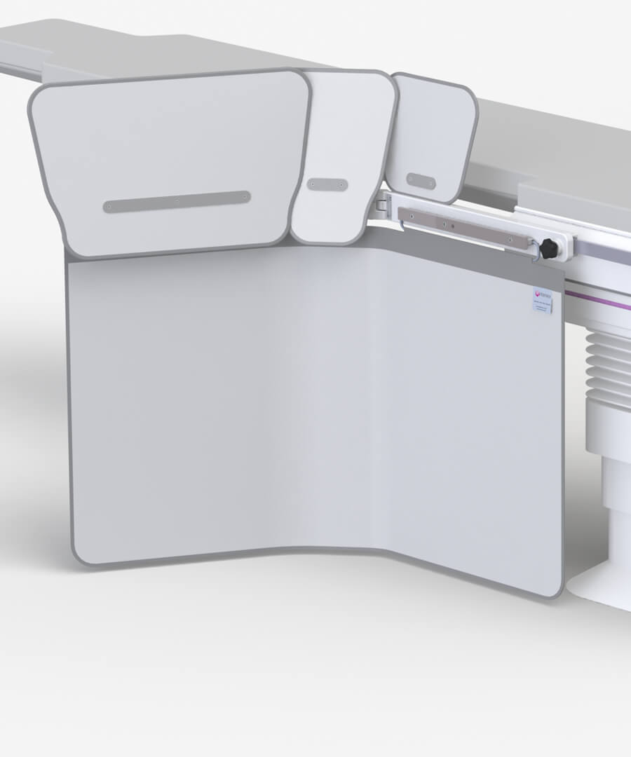 Lower body table shields with a double friction joint, accessory rail and optional top shields.