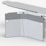 Collision resilient table shield with two overlapping curtains, double friction joint, and two versions of the 57 cm accessory rail. Optional top shields.