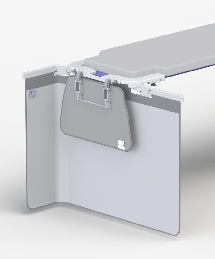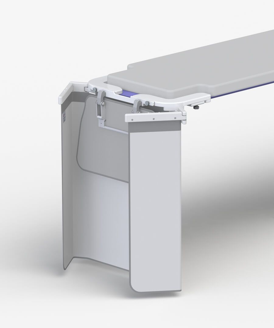 Lower body table shields with a double friction joint, accessory rail and optional top shields.