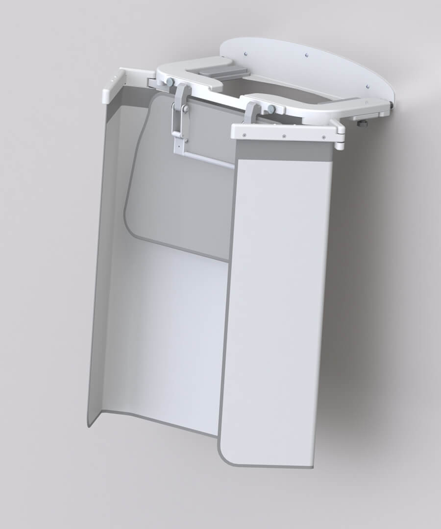 Lightweight and durable structure with a fixed central section and two pivotal side arms supporting a flexible 0.5 mm lead equivalent curtain.