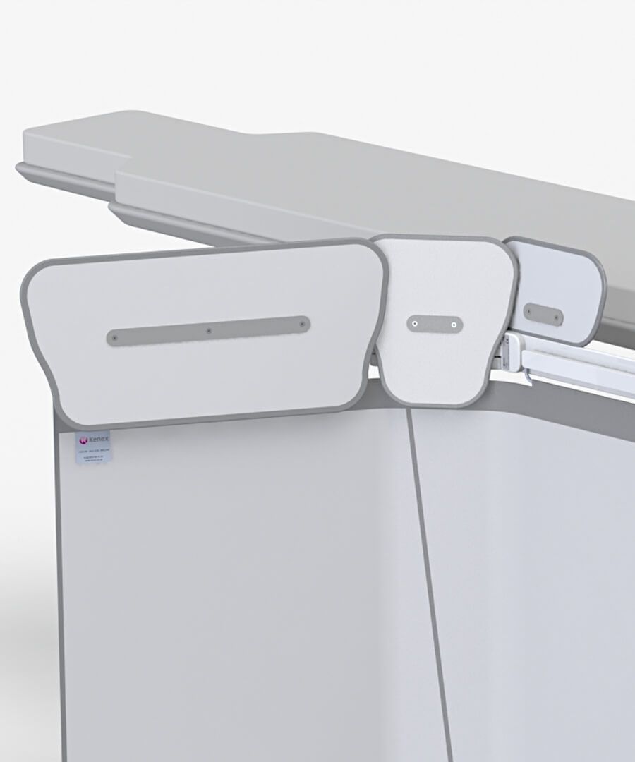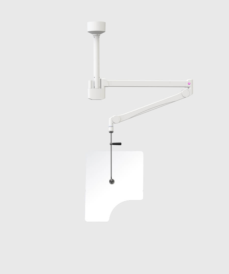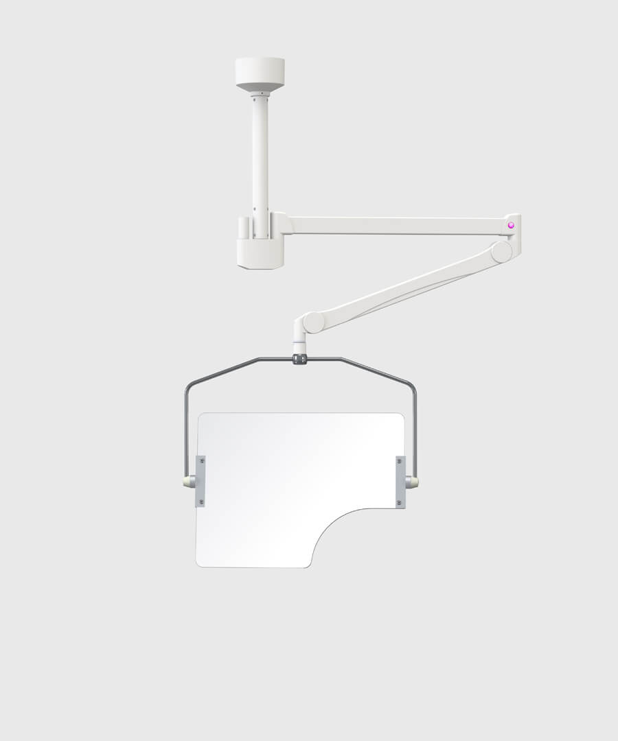 313/A2Lightweight and durable structure with a fixed central section and two pivotal side arms supporting a flexible 0.5 mm lead equivalent curtain.